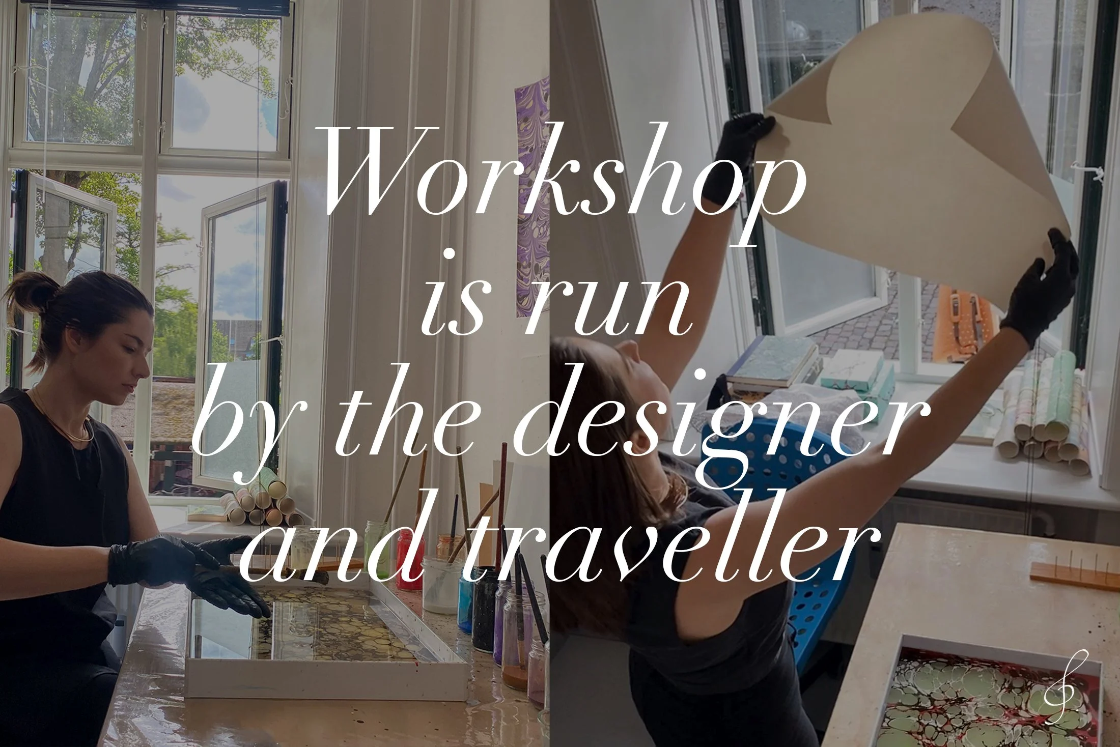 It is a painting technique on a floating surface called size, which is beforehand prepared by mixing water and carragean powder. You place a sheet of paper on top and lift it up to reveal the imprinted image. Every piece of marbled paper comes differently that is why it is such a unique type of printmaking. During the workshop we will experiment with tools and gestures that are applied to create different paint movements as well as explore the chance to create unpredictable new patterns.